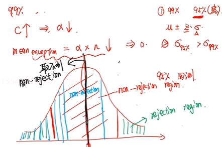 同学你好,正态分布是对称的,左右侧的拒绝域都是相等的面积,99%的置信区间比95%有更加宽的非拒绝域;
