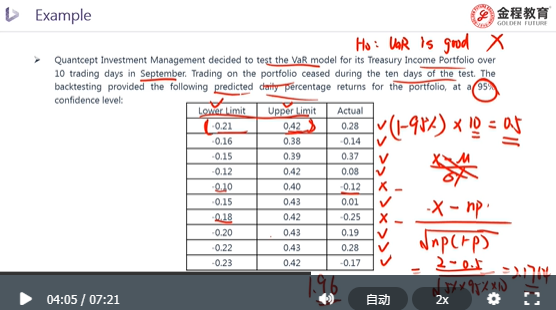同学你好,我们通过判断actaul值是否落在这个区间里来判断存在几个exception,可以看到是有2个的,那么我们计算一下检验统计量是等于2.1764>1.96,是拒绝原假设的,说明模型是不可靠的,选择D选项。