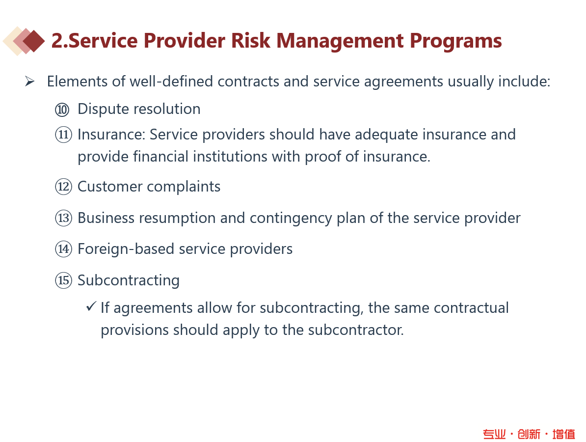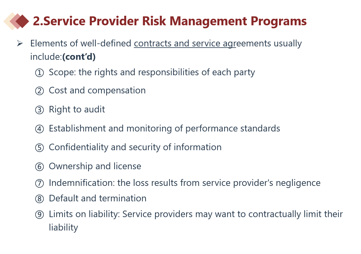 学员你好这个问题是讲义中的很直接的知识点,说明了合同中可以包括的点。不过,D选项是一个干扰项目,原因是这个选项说的其实是信用风险的CCP管理的办法,和操作风险中的合同关系不大。