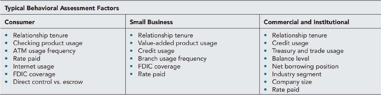 同学你好,这道题实际上就是考察是以上三类银行客户都需要考虑的行为评估因素。也就是下面这张表格的内容,这里是个固定知识,记住即可。比如commercial and institutional更注意公司规模,针对个人顾客,会关注互联网的使用情况。对于customer,small company以及commercial and institutional,他们都会关心Relationship tenure即与客户之间的关系。