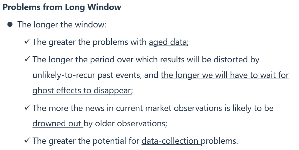 同学你好,涉及到鬼魂效应的知识点在这里。简单来说鬼魂效应,指的是历史模拟法得到的VAR值,对市场实际变化并不敏感。比如你发的这张图,之前的数据都是两位数的,在99%VAR值,我们得到的损失是10。来到第二天,现在市场出现了三位数损失,但是99%VAR值是11,我对市场上的100的极端损失数据并没有察觉。到了第三天,99%VAR是100,此时,我们才发现市场出现了极端波动,这种现象就像鬼魂一样,突然出现突然消失。因此是叫鬼魂效应。