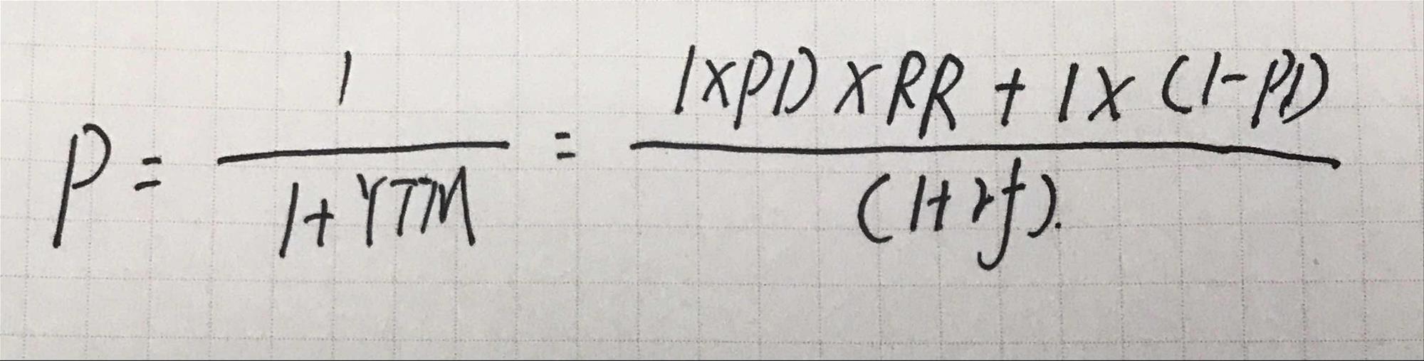 同学你好,首先我们看看下图的公式,这个是上课我们学到的公式,通过期初价格来倒推出违约概率的。那么左边就是将1块钱以YTM的利率来折现。右边的分子就是一个二项分布,要么债券违约(价值为1*PD*RR,即在违约的情况下我们能回收的部分),要么不违约(价值为1*(1-PD)),将违约和不违约的加权之后,通过无风险利率进行折现。因此左边和右边的数值应该相等。