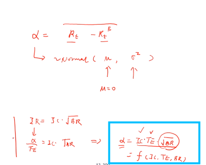 同学你好,首先在这个图里面,提到了这个推导公式,再者,公式里的根号BR,也就是score是服从标准正态分布,即均值为0,方差为1。公式里的TE就是我们这里的σ。在调整alpha的规模的时候,α=σ*IC*score,因为σ和IC为常数,则α~N(0,(σ*IC*1)^2),所以alpha的波动率为σ*IC。(这里的乘以1就是这个score)