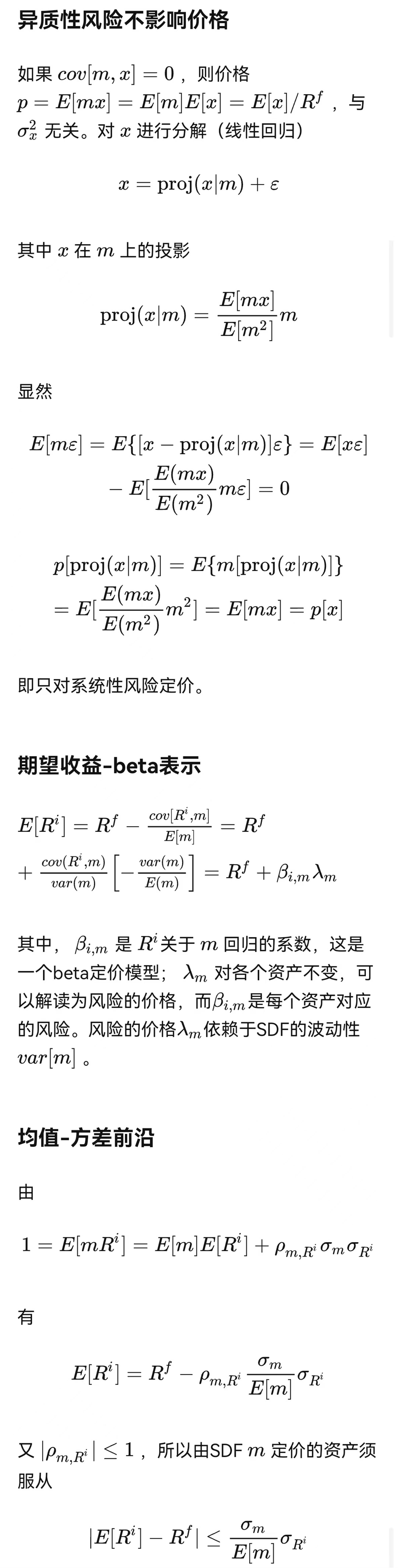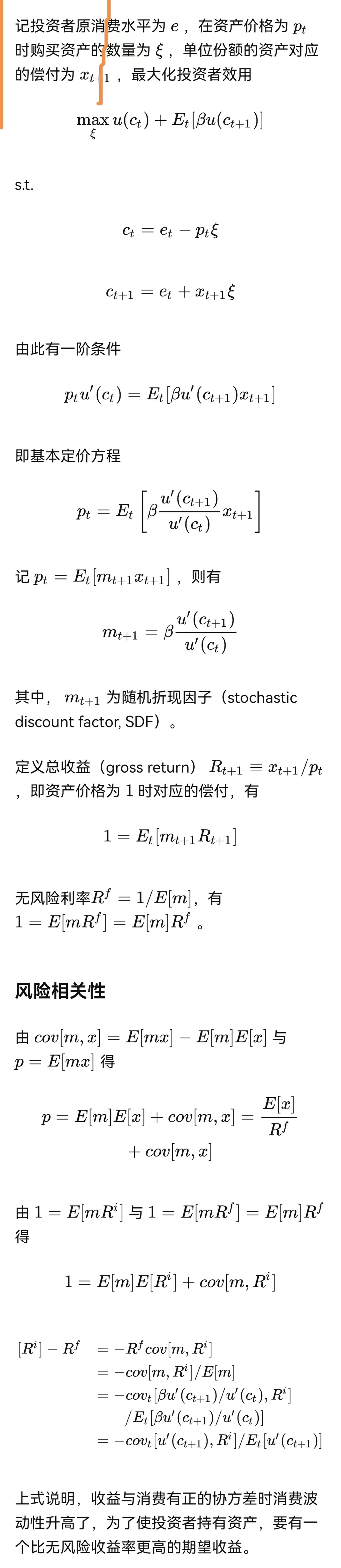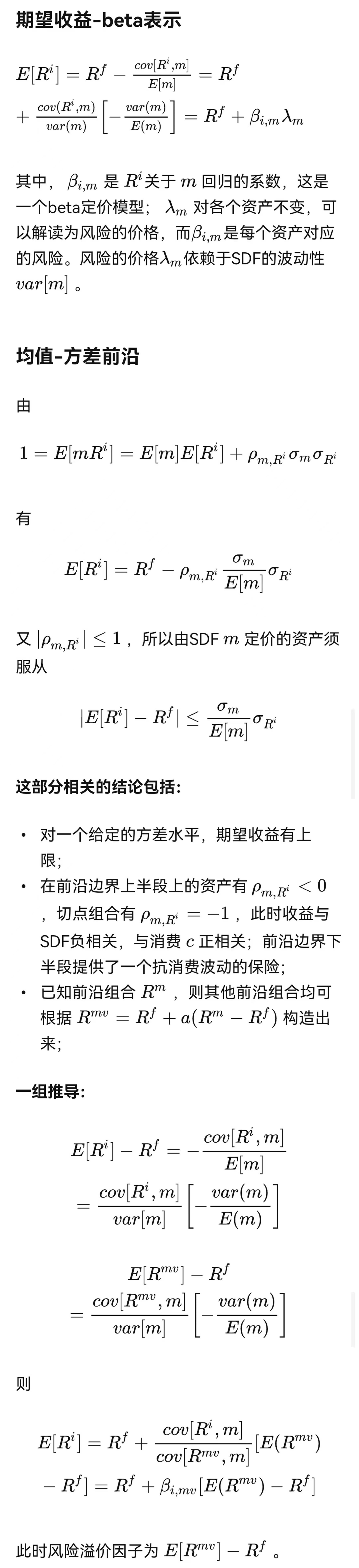 对于SDF:E(ri)=rf+β1*(ra-rf)+β2*(rb-rf)+... ...,其中,(ra-rf)表示:基于a(例如:通胀(inflation))这一因素的“a(通胀)风险溢价”;(rb-rf)表示:基于b(例如:经济增长(economic growth))这一因素的“b(经济增长)风险溢价”。