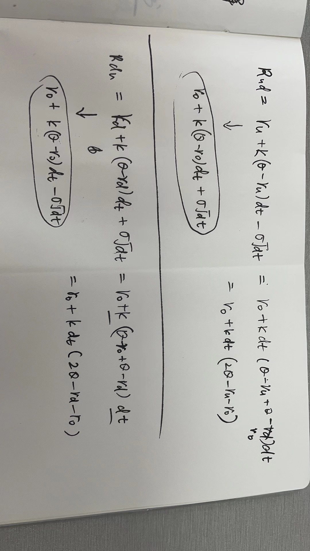 学员你好,这里应该用+号。不过在Vasicek模型里面,Rdu不等于Rdu,这主要是因为均值复归模型的当前利率不同的话,趋势项也会不一样。你可以在公式里面把Ru和Rd带进去,然后再看那一下最终的结果。