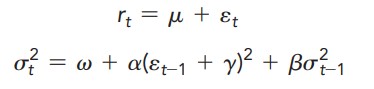 对于positive shock/negative shock对于下一期volatility的非对称影响,常见使用的GARCH模型包括Asymmetry GARCH (AGARCH),Threshold GARCH (GJR-GARCH/TGARCH),Exponential GARCH (EGARCH)等。这里原版书上取的是最简单的AGARCH,公式见下图。其中公式 (1) 可用ARMA process建模;公式 (2) 中相较于基础GARCH模型,在epsilon的基础上加上参数gamma后再取平方。若gamma的估计取值为负,则negative shock的程度会被放大、下一期volatility更大;positive shock的程度会被缩小、下一期volatility更小。根据该模型设定,非对称影响得以体现。GJR-GARCH与EGARCH对于不对称性的建模更为复杂,不需要了解。