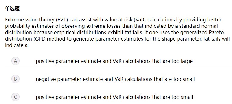 题目这边问的是如果使用POT方法(其假设超过阈值的部分服从广义帕累托分布),且数据中存在肥尾,那么这会对广义帕累托分布的shape parameter(又称tail index,用于描述分布的尾部)产生什么样的影响,以及原先基于标准正态分布估计的VaR值是高估还是低估了风险。首先,由于数据中的肥尾特征,这会使得shape parameter为正;其次,由于肥尾的存在,原先按照 标准正态分布估计的VaR值必然会低估风险(因为分位点相对较小)。