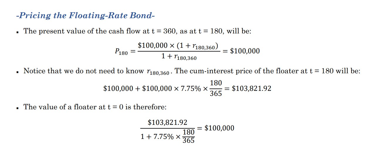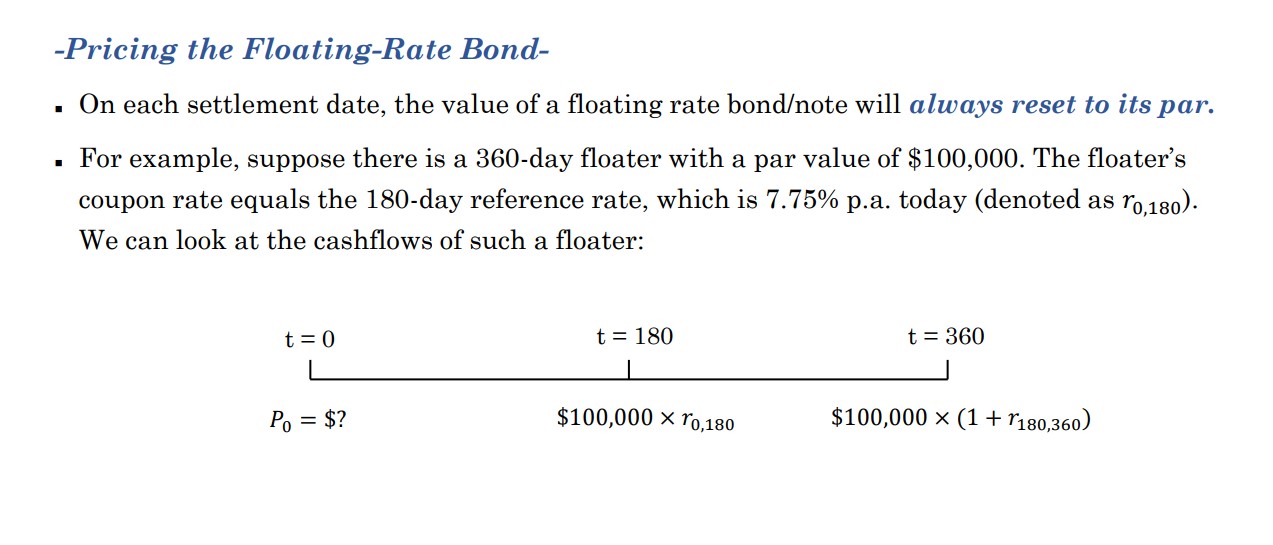 同学你好。它与fixed-coupon bond的区别就是在于coupon是浮动的,同学这边说的没错。至于定价,建议同学记住这个结论就可以了,在票息重置日即刻支付完coupon之后,其价格等于面值。这个是一级的考点,二级只会考到这个结论。至于具体推导感兴趣可以看附图。