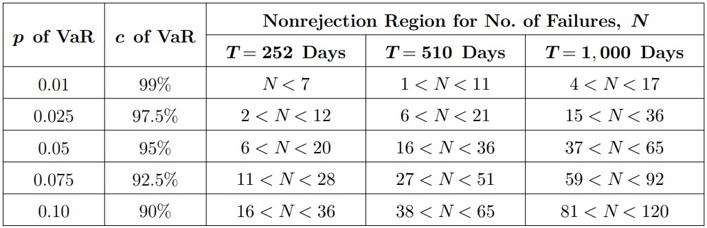 解析中的意思是,在相同的假设检验置信水平下,对于95% VaR做检验的非拒绝域较99% VaR的非拒绝域更宽,这可由下表中看出。以99% VaR & 252天为例:此时非拒绝域为N < 7,意为若exceptions < 7则不拒绝原假设(VaR模型正确)。此处的问题是,N若过大,VaR模型低估风险、应拒绝原假设;N若过小,VaR模型高估风险、也应拒绝原假设,而非拒绝域N < 7意味着即使N过小,我们也不会拒绝错误的模型。因此,power of test较低。溯其本源,这是因为VaR的置信水平过高导致几乎很难出现比VaR值还高的损失,这使得我们无法判断过小的N究竟意味着模型高估了风险还是模型本无误。