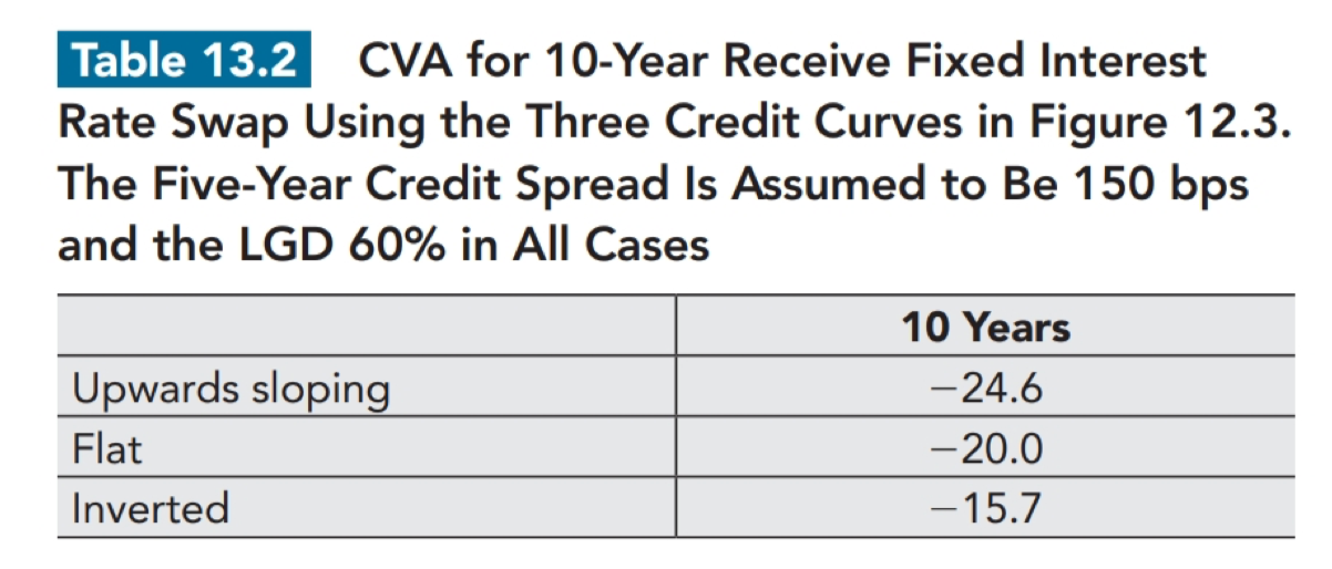 然后再是讲义的情况讲义使用了原版书中的一个案例,这个案例的前提条件是一个10年期产品前五年的spread一样,然后问spread形状对于CVA的影响,这个时候会分出前5年和后5年来分段研究,那么形状对于最终结果就很难判断了(前5年的影响应该是upward curve导致的CVA更小,但是后5年的影响应该是upward curve导致的CVA更大),讲义给出来的数据是一段时间的实证数据(我放在了图中),你会发现其实upward导致的CVA反而更大,这其实进一步说明了后5年的spread curve上涨明显(这个结论也是原书中的一句话,我也贴在图片里面了)。换句话说,也可能是upward导致的CVA更小,那么结论应该是后5年的spread curve上升不明显。