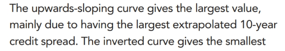 我先说这个题,他想要提问,在考虑了spread和LGD对于CVA的影响后,评估选项的说法的正确性。B选项说了spread curve的形状对于CVA的影响,如果此时spread和LGD也是不同的话,此时CVA是没法比较的,所以我们需要将问题再补充为:在spread和LGD保持不变的情况下,spread curve的形状对于CVA的影响。那么这样一来图①的研究方法(说明在一段时间,比如5年内的spread不变,或者5年的累计违约概率不变),会合理一些。然后在分析得出upward curve会有更低的CVA。