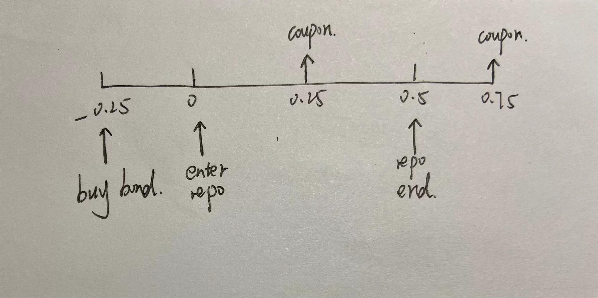 同学你好,你的时间线是正确的,但是我这里也把我的思考方式放上去了。我是将进入repo的时候当成0时刻,-3个月即-0.25个月为买入债券的时候。(但是你说的,在0时刻产生coupon是不对的,刚买入债券是不会有coupon的)