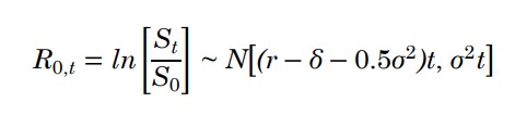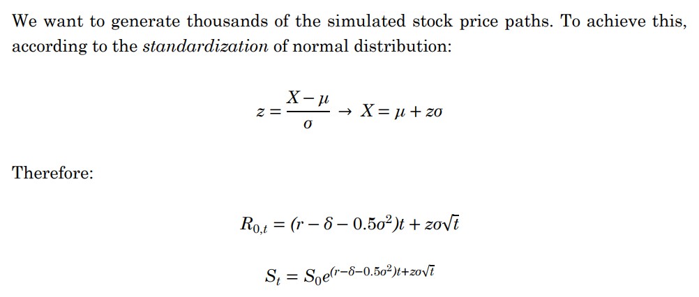 比如我们现在想要模拟一只股票的价格。首先我们需要对股票价格的分布做出假设,一般默认使用的是对数正态分布。这意味着连续复利收益率服从正态分布(见图1)。接下来,我们来建模对数正态分布下股票价格的演变路径。根据正态分布标准化(z = (X - mu)/Sigma)的逆运算(X = mu + z*Sigma),我们可以出如图2中的公式,该公式描述了股票价格的演变。其中,z ~ N(0, 1)是一个标准正态变量,而我们需要通过发射成千上万个标准正态随机数z来构建大量股票价格路径。