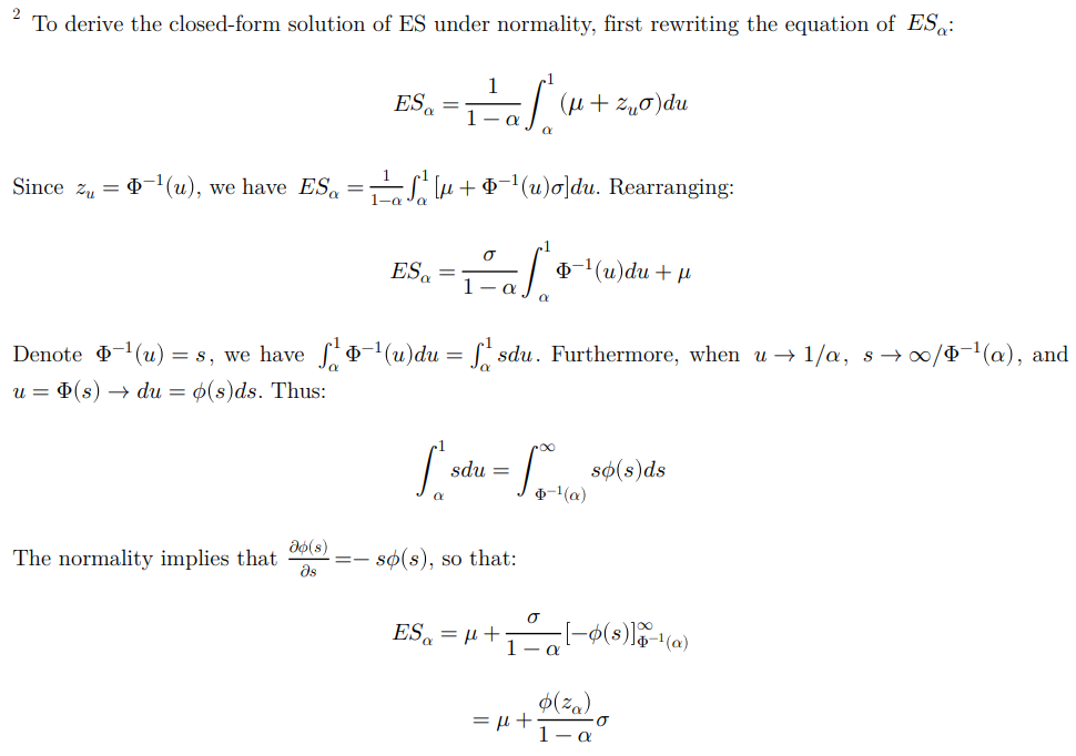 同学您好。这个是一个既定的结论,就是在一些比较常规的分布下(比如假设损失变量服从正态、t分布等)是可以得到ES的解析解的。解析解就是有一个具体的公式、把参数代进去就能得到数值;反之,有一些复杂分布下的ES只能通过模拟的方法来获得。这里记住结论即可,对推到感兴趣的话可以看下面附的图,是正态分布下的ES解析解(其中X代表损失变量)。