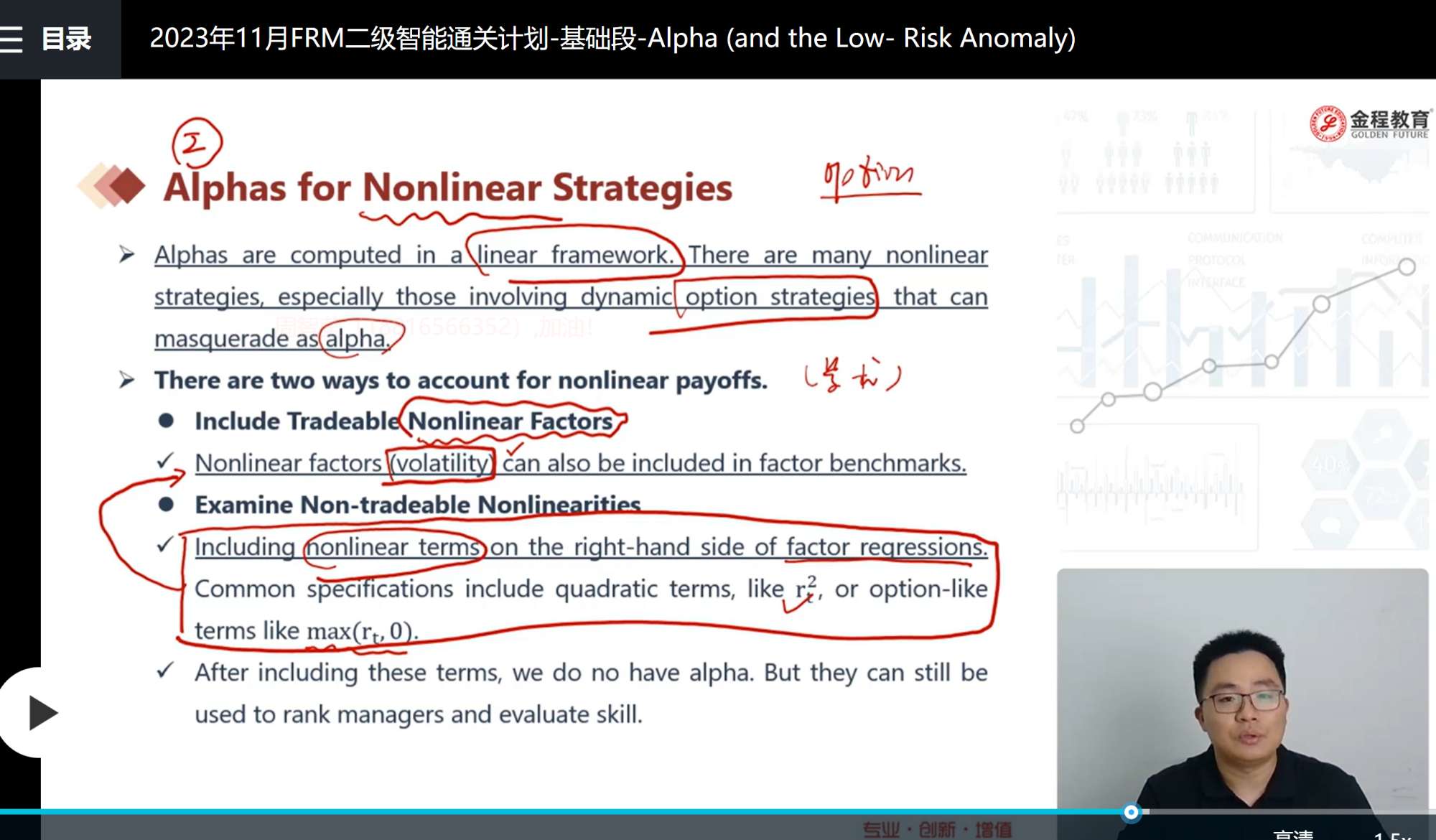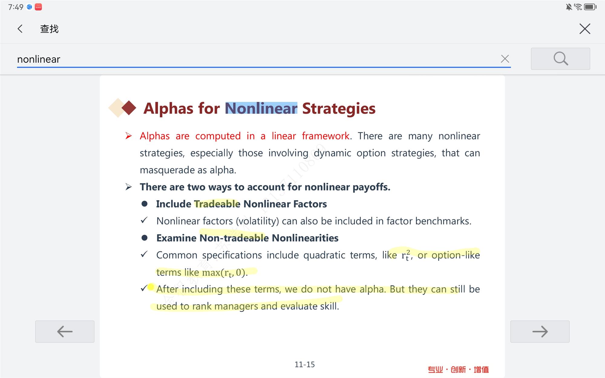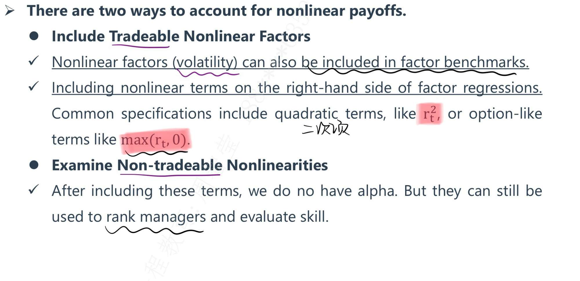 同学你好,c选项指的是,非线性情况下,对于阿尔法的计算会产生错误,这时候要分为两种情况,一种是可交易型tradeable非线性,这种情况可以通过,在模型中加入非线性的因子就比如说波动率啊这一类的。对于non traceable且非线性的情况,可以加入平方项或者是max min函数,但是在这种情况下,值得注意的是,你计算出来的,并不是真正意义上的阿尔法了,但是能够衡量经理人的业绩能力