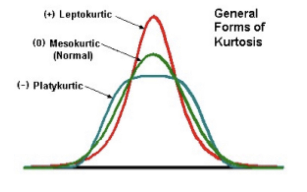 峰度则分为leptokurtic, platykurtic和meso kurtic。Meso kurtic就是常峰态,峰度等于3,超额峰度等于0(例:正态分布)。Leptokurtic是尖峰态,峰度大于3,超额峰度大于0,具体的体现是尾部偏肥、顶峰更尖(假设同方差)。Platykurtic是低峰态,峰度小于3,超额峰度小于0,具体的体现是尾部偏瘦、顶峰更平(假设同方差)。见图2。