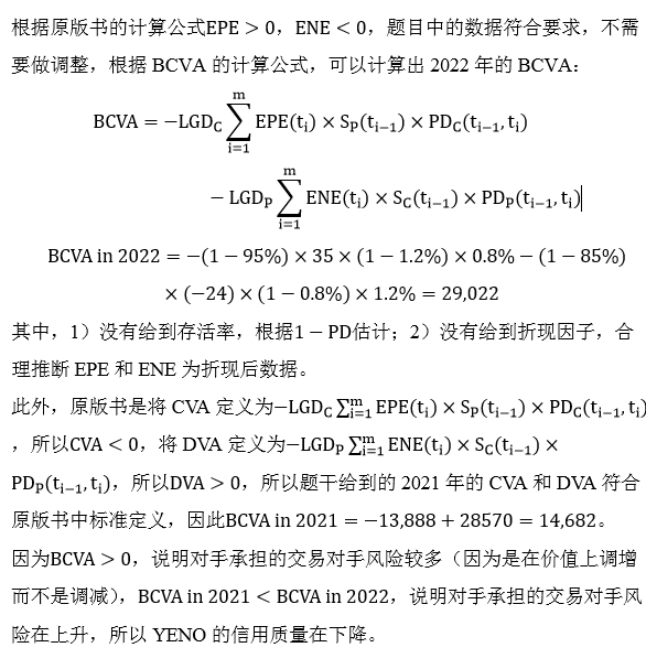 老师,快来看看这道真题,连着几天都考了。我的问题是,CVA,DVA的符号我分不太清。我一直觉得CVA就是应该从价值里调减的,而DVA就是价值调增的。按照他这么个算法,一开始CVA是负的直接+的DVA,但在2022年又用的CVA-DVA。再有一个,这题BCVA算出来是正的,说明应该在总价值上进行-,如果是负的,因为-了一个负的,变成了正的,那应该信用环境变好了才对吧?