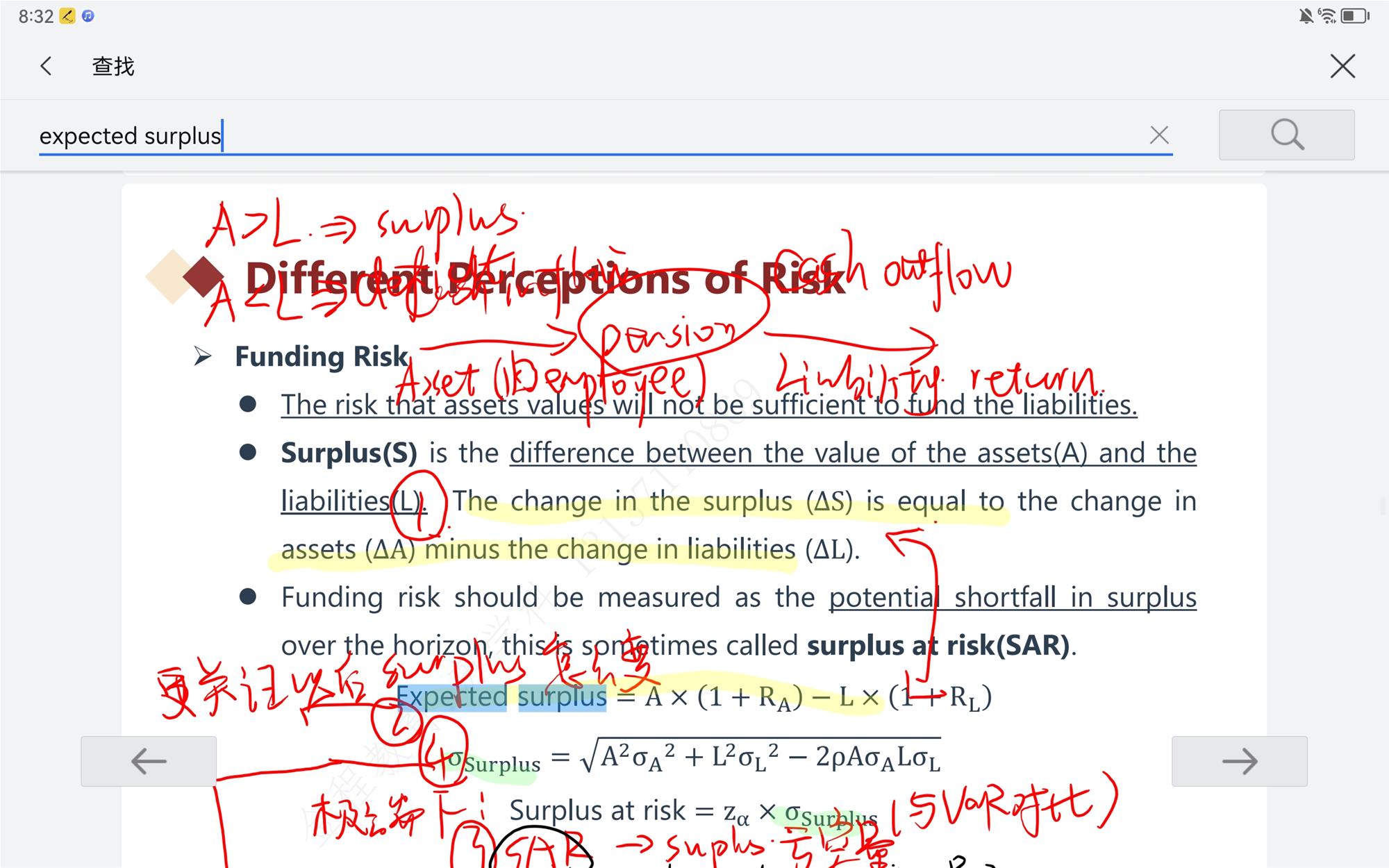 其实是有考虑到时间因素的,在讲义中,finding risk的第三点有提到是over horizon,也就是一段时间的。具体表现在公式中,是expected surplus的资产和负债是乘以了各自的利率了(可以把其理解为单利的变化,这就是考虑到了时间的因素(当然,对于var和sar会有更多的延伸公式,在market risk有讲到,如何具体把时间t作为变量,考虑其中)