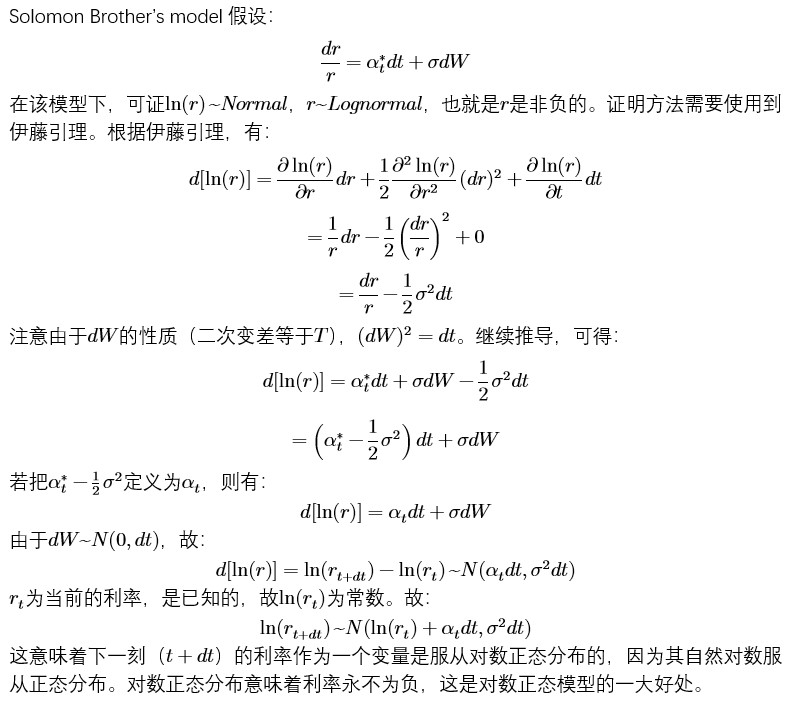 同学你好。这个内容比较深了,简单来说,这里转换至d[ln(r)]可以使得d[ln(r)] = ln(r1/r0)(其中r0是当前的短期利率,r1是下一刻的短期利率)服从正态分布,进而使得r1服从对数正态分布(因为ln(r1/r0) = ln(r1) - ln(r0),所以ln(r1) - ln(r0)服从正态分布;而r0当前是已知的,可以当作是常数,因此ln(r1)服从正态分布,故r1服从对数正态分布)。在对数正态分布下,变量永不为负,所以该模型使得利率永不为负。从考试的角度来说记住这两个模型隶属于哪一类、长什么样子就可以了。如果对这部分内容感兴趣且有一定数学基础的话可以看一看下图推导。