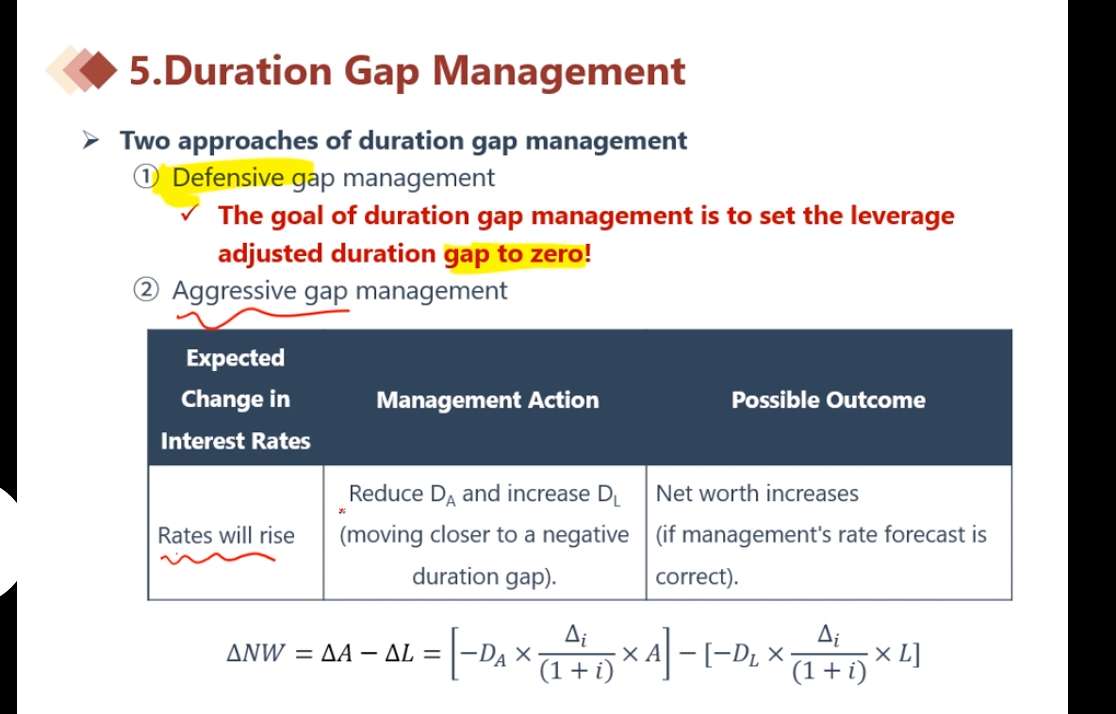 按照图上的情况,在利率上升的情况,我更希望久期缺口小于0,即negative duration gap,理由是利率上升对于久期敏感性资产和负债都是造成下降的作用(利率和久期是反向关系),也就是资产和负债的价值就会下降,但此时由于GAP小于0,即Duration资产小于duration负债,在利率上升的情况,负债端下降的更多,资产端下降的更少,因此就能保证NW大于0。