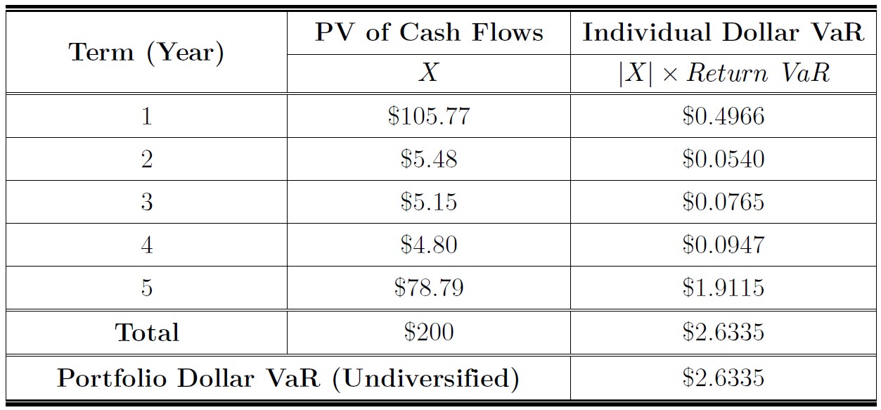 至于课件上这里,old zero value是一开始一个面值为$1的零息债券今天的现值,new zero value则是在一定置信水平下这个面值为$1的零息债券价格跌到了多少。还是以第一年的现金流为例。此时以%计的VaR = 0.004696,意味着在一定置信水平下最大的损失是0.4696%,所以面值为$1的零息债券价格在这个置信水平下会跌到$0.9615*(1 - 0.4696%) = 0.9570。一个面值为$1的零息债券在该置信水平下会跌到$0.9570,那么一个面值为$110(也就是第一年的现金流)的零息债券就会跌到$110*0.9570 = $105.27。如法炮制,我们可以计算出每笔现金流映射到的零息债券它们各自在一定置信水平下会跌到什么价位。最后,我们将所有零息债券的新价格加总,得到的就是整体组合在一定置信水平下跌到哪里了,这里是从$200跌到$197.37。据此我们可以求出VaR = |$197.37 - $200| = $2.63。