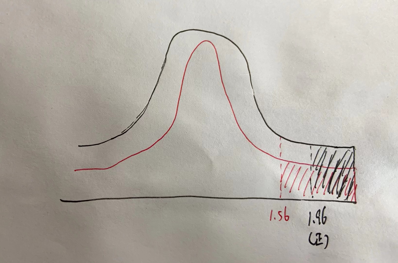 同学你好,这里我把图画了一下,你会发现红色部分是1.56,黑色是1.96,两个颜色如果想保持一样的面积的话,红色部分就应该比黑色部分瘦一点(矮一点),所以1.56这个历史分布是一个瘦尾。