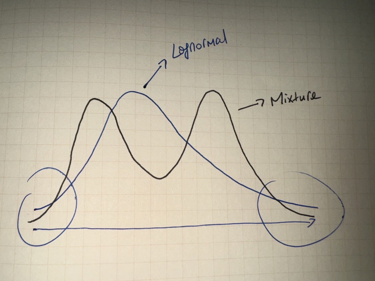 同学你好。当出现single large jump时,隐含分布相当于两个对数正态分布的混合(mixture of distributions)。这里图中画的不是特别清楚,实际上混合分布的两端尾部较原对数正态分布的尾部会更薄,因为本身两个分布混合、各自的权重都是小于1的(比如50% vs. 50%),见下图示意。因为隐含分布的尾部更薄,意味着当价格足够低的时候,它变得更低的概率会更小;当价格足够高的时候,它变得更高的概率也会更小,进而两端的Implied volatility更低。而由于价格既有可能向上跳动,也有可能向下跳动,但投资者当前并不知道具体会向哪个方向跳动,所以ATM option反而是最波动的。
