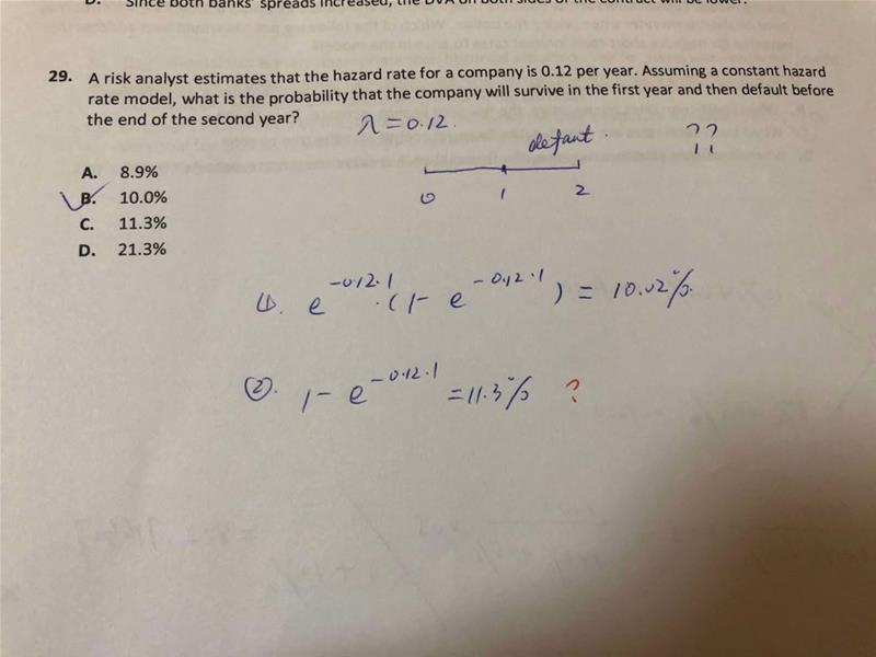 老师,这道题我感觉两种算法都说得通,第一种就是算一个联合概率,第二种用指数分布里的conditional default probability计算为什么不对呢?他不是无记忆性,而且定义就是(given that there has been no default prior to time t)? 这里很confuse,求解答,谢谢!