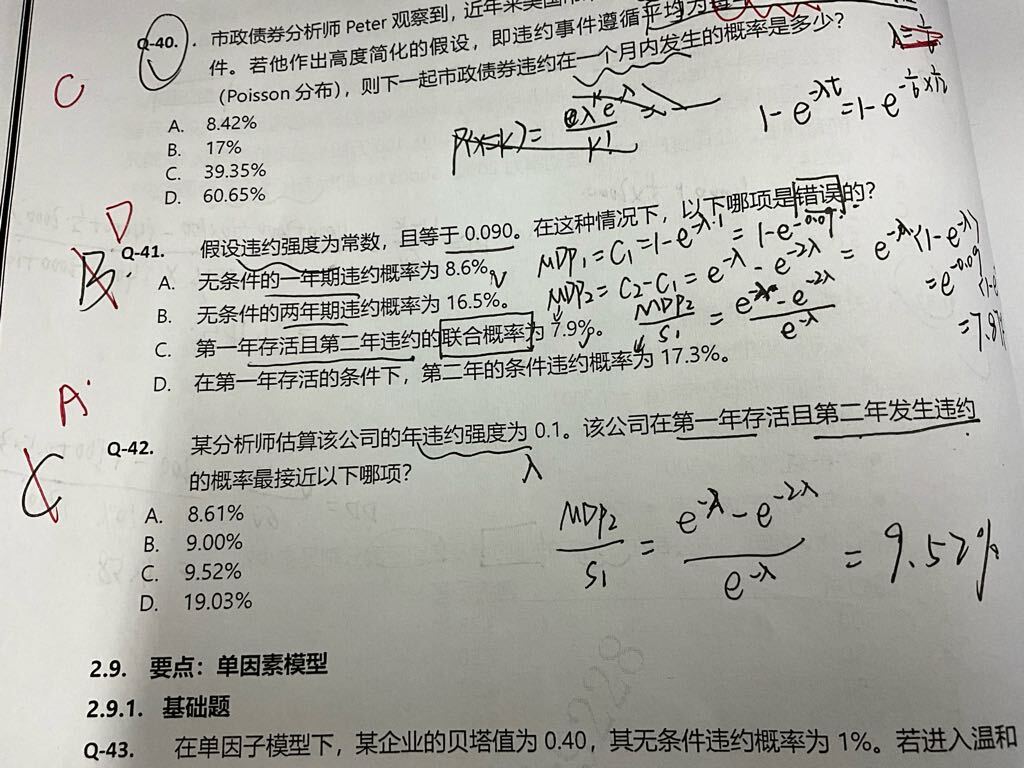 1.请分别计算一下41题第B、C、D选项,B选项不应该是计算的第二年的边际违约概率吗? 2.第42题不是应该要用条件违约概率的公式来计算吗?