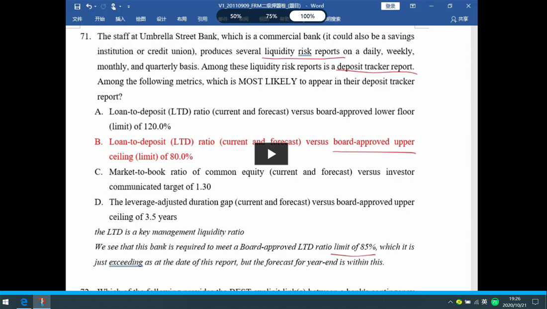 押题71题 答案里85%是什么意思啊 为什么选择B?是因为Loan to deposit ratio 越小越好吗,B超过了董事会的上限所以应该出现在报告里 ?是这么解释的吗?