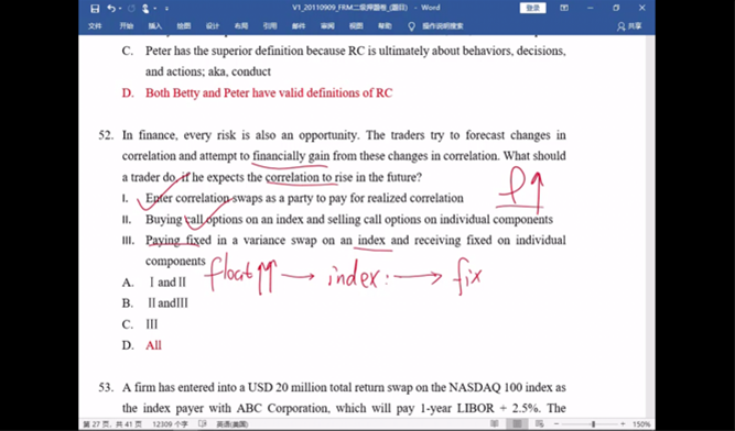 52题,第一选项,realized correlation到底是预先规定的fixed,还是事后真实实现的?第二选项,如果相关性上升,则说明风险上升,此时买call option on index估计赚不到钱,short individual stock的option赔钱可能大吧?