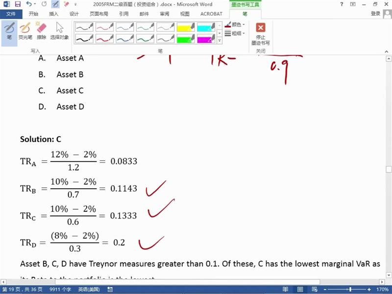 此题的文字解释和老师课上说的不一样。treynor ratio,老师课上除以的是0.9,文字解释是除以1.2,所以,是应该除以beta to the index 还是beta to the portfolio?
