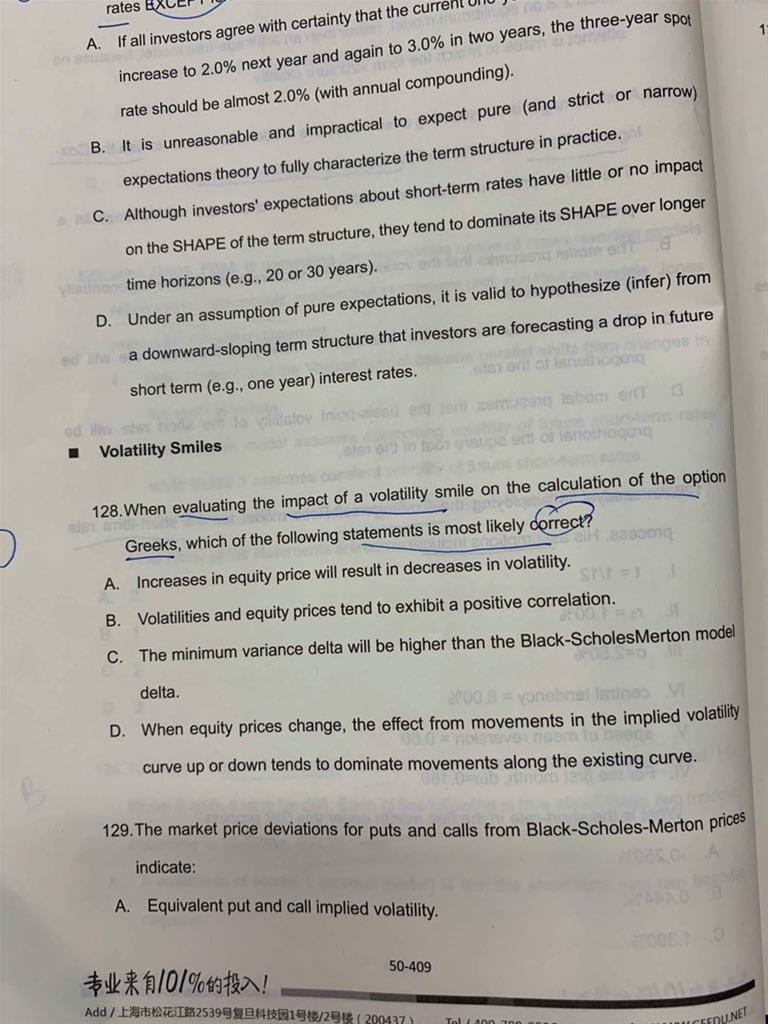 习题128:老师好,这道题A选项,当时讲reasons for smile in equity option的时候,老师说leverage=debt/equity,如果equity下降,说明leverage上升,所以风险提高,所以波动率上升,那么同理,debt上升leverage下降,风险下降,波动率也是下降的吧?A为什么不对呢?答案里为什么说equity上升会导致波动率上升呢