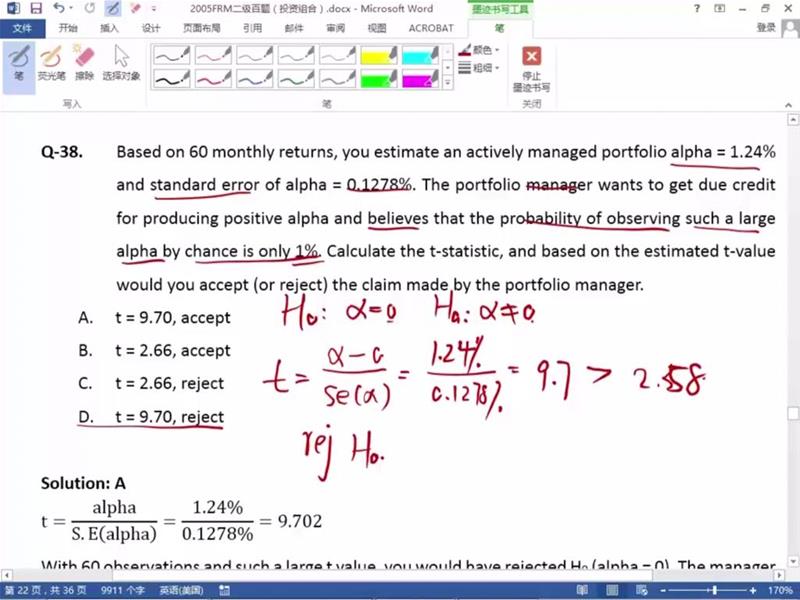 老师 这里面观察到大的阿尔法的概率只有1%不就说明很少见,几乎不会有大的阿尔法吗,那就是阿尔法等于0,不就是reject吗
