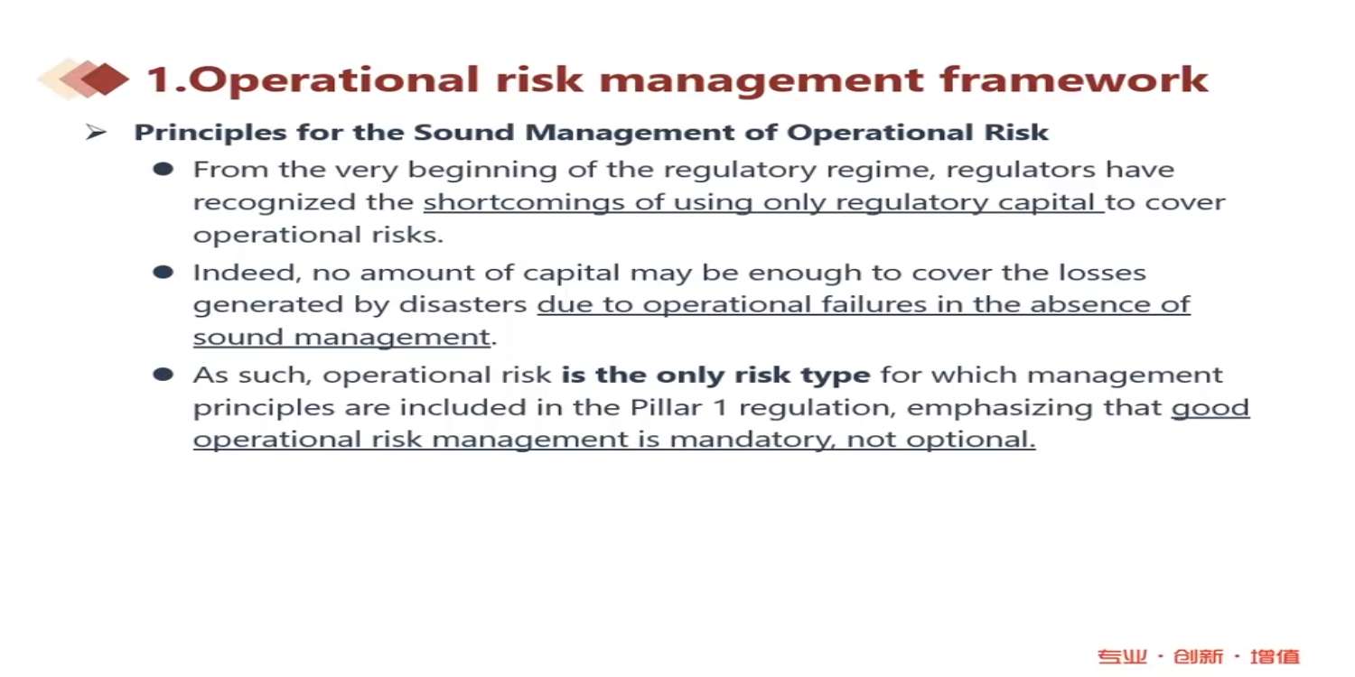 - 不理解这里为什么Risk Chaampions & Business-Line Managers 负责monitor Operational Risk Function Operational Risk Committee 负责act 难道不应该是一线业务人员负责act,然后上一级负责monitor更贴切嘛