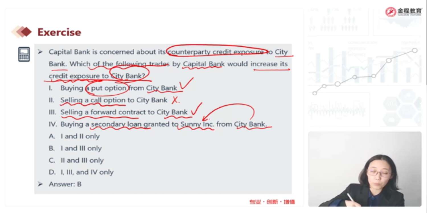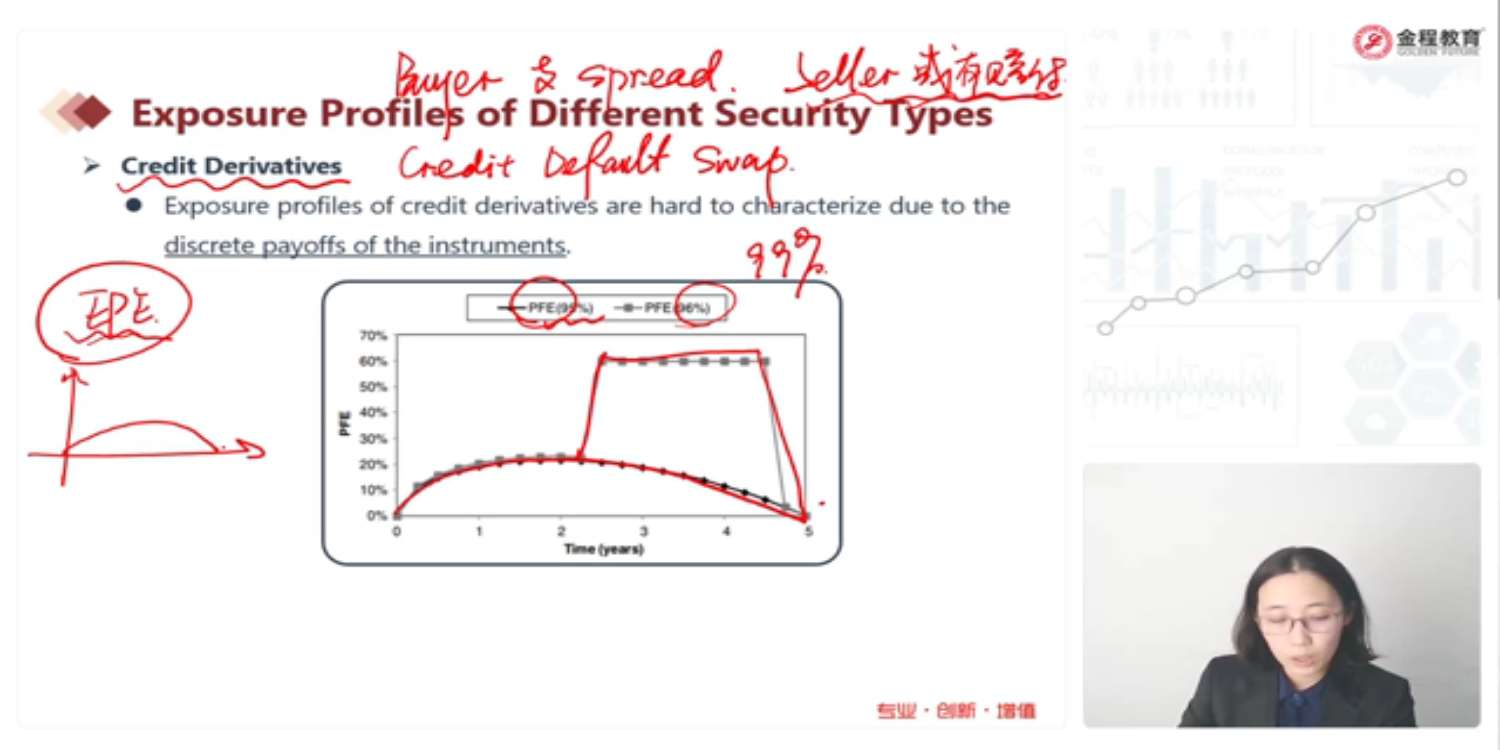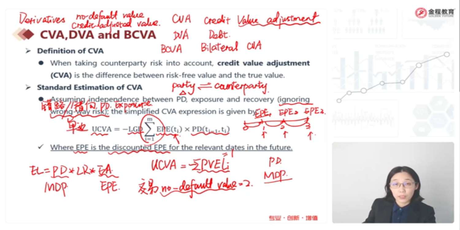 老师举的例子,一笔交易,它的不违约的价值是2,这个价值是什么价值呀?他的来源是什么呢?对应的是资产的价值么?还是这笔交易对应的收益呀?而且计算出的UCVA是-1,所以这笔交易的价值是2-1等于1,这个1是最后获得的收益吗?(但我的理解是,party既然承担了交易对手风险,那么它不应该要求更高的风险补偿吗?但反而这笔交易对应的价值降低了。所以不太明白这笔交易的价值怎么理解