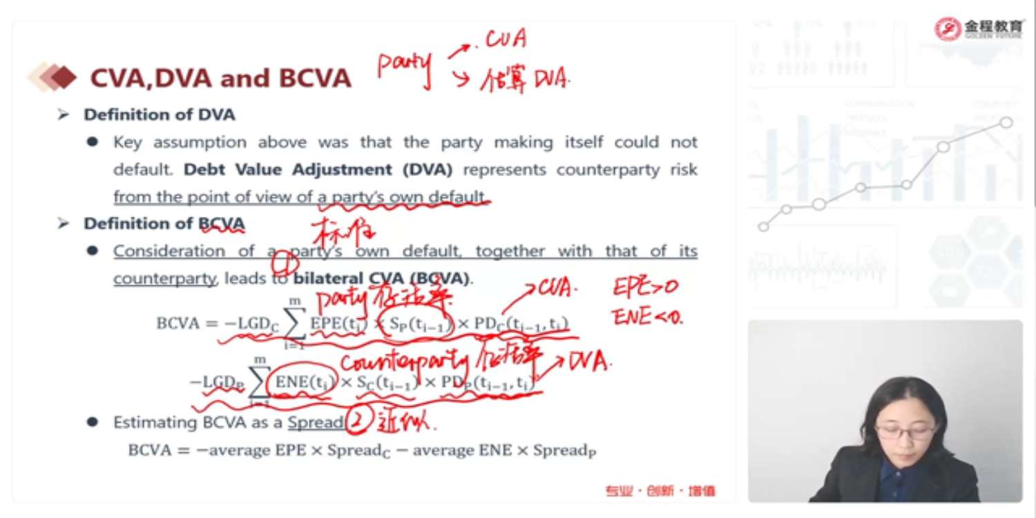 这个ENE要怎么理解呀?本来DVA是party需要考虑的,对方因为party违约对party进行的价值调整。所以在计算DVA时仍是party考虑的,那么到底是站在party角度还是countryparty的角度呢?这个负敞口是countryparty的吗?而且既然CVA对于party来说是成本,那么DVA最后--负负得正后,是正数,这个计算的DVA有什么含义呢?不是成本,难道是收益吗?最后计算的考虑了双边违约情况的BCVA是什么含义呀?