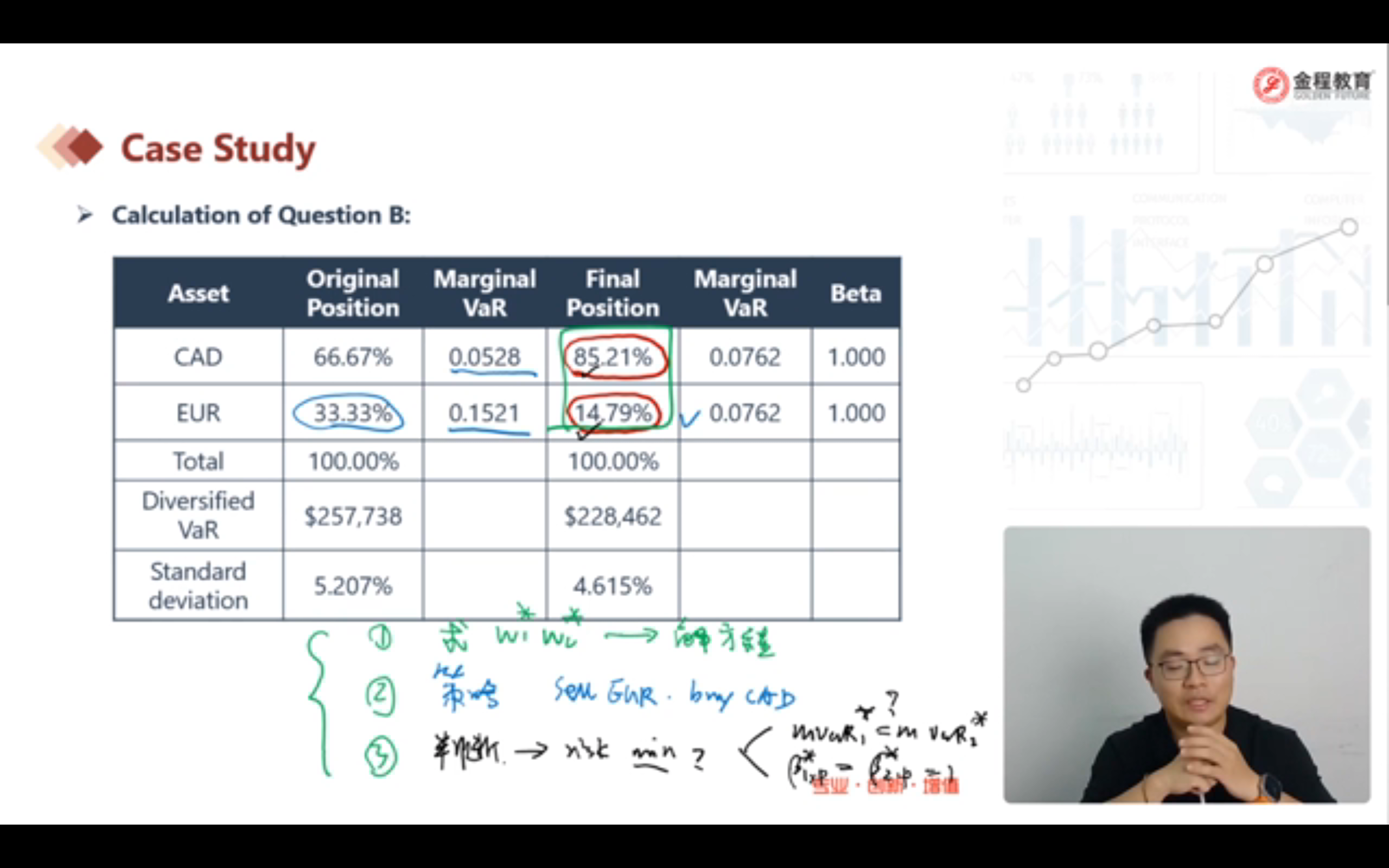 老师在这里说的考法3中,若题中给了新的权重,比如w1=85.21%.w2=14.79%.让判断新权重下投资组合的风险是否达到了最小。解法是判断新的MVaR1和新的MVaR2是否相等,或者新的贝塔1和新的贝塔2是否相等且等于1,老师能基于这个题,求一下新的MVaR1,MVaR2和贝塔1.2吗?我没推出来,因为1和p的相关系数没算出来