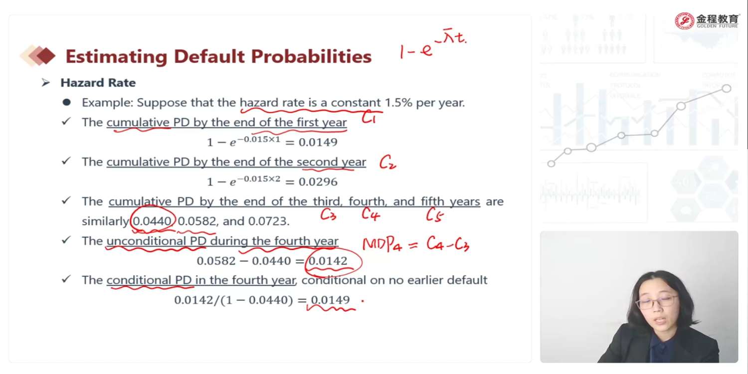 老师条件违约概率对于分子是MDP对比成P(AB)这点我还是不太理解,MDP不是相当于(1-d1)*d2吗?相当于1期不违约的条件下,2期违约,MPD本身不就是个条件概率吗?为何还要除以(1-C1)呢?conditional PD这个知识点能再解释一下吗?