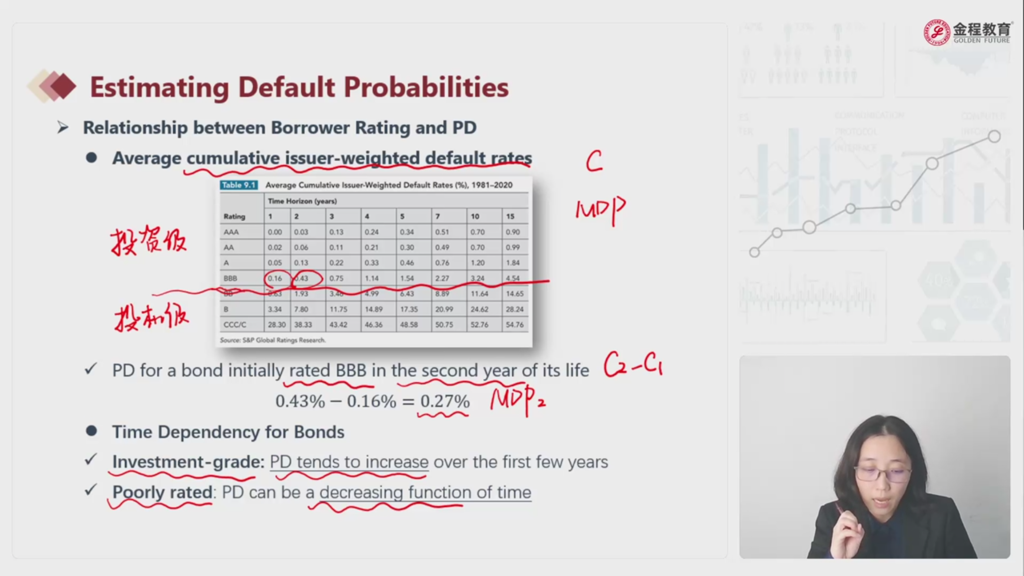 看图表随着时间的增加,违约概率都是增加的,没有看出投机级是下降的呀