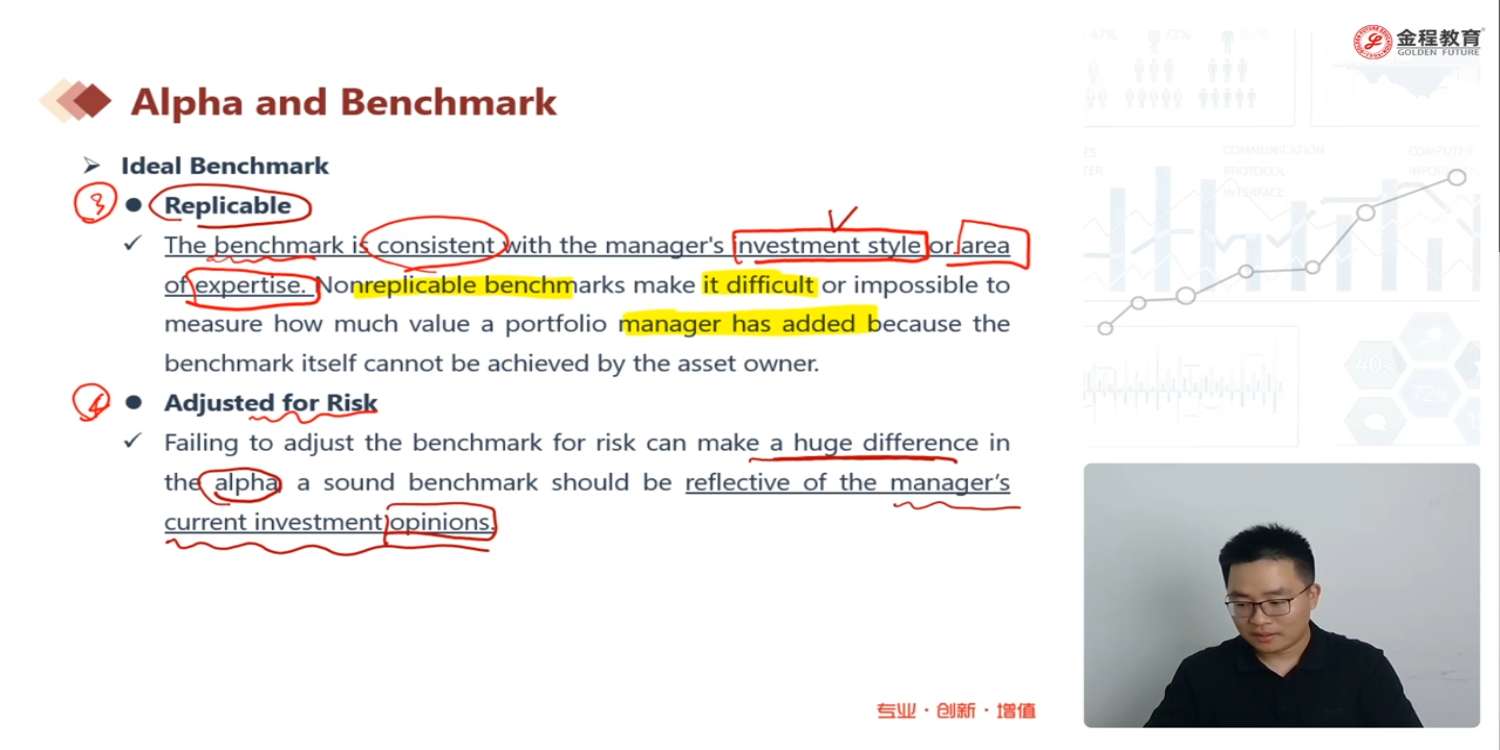 老师,3和4我感觉意思比较相近,3说的是benchmark与投资风格和专业领域保持一致,4指的是健全的基准能反映出基金经理的投资观点,换句话说也是说benchmark与投资风格保持一致,所以不是很好区分,后面说基准选capm,或者三因素或四因素是体现了3的特性,但4的特性也有吧