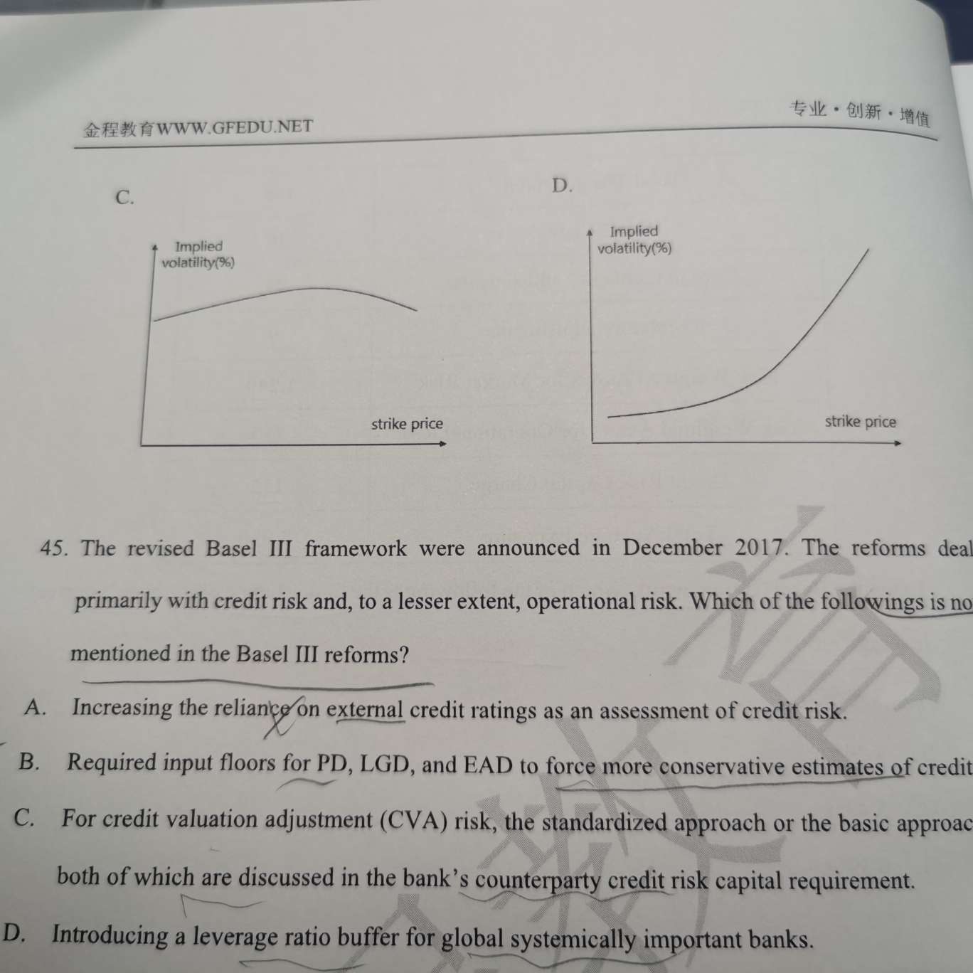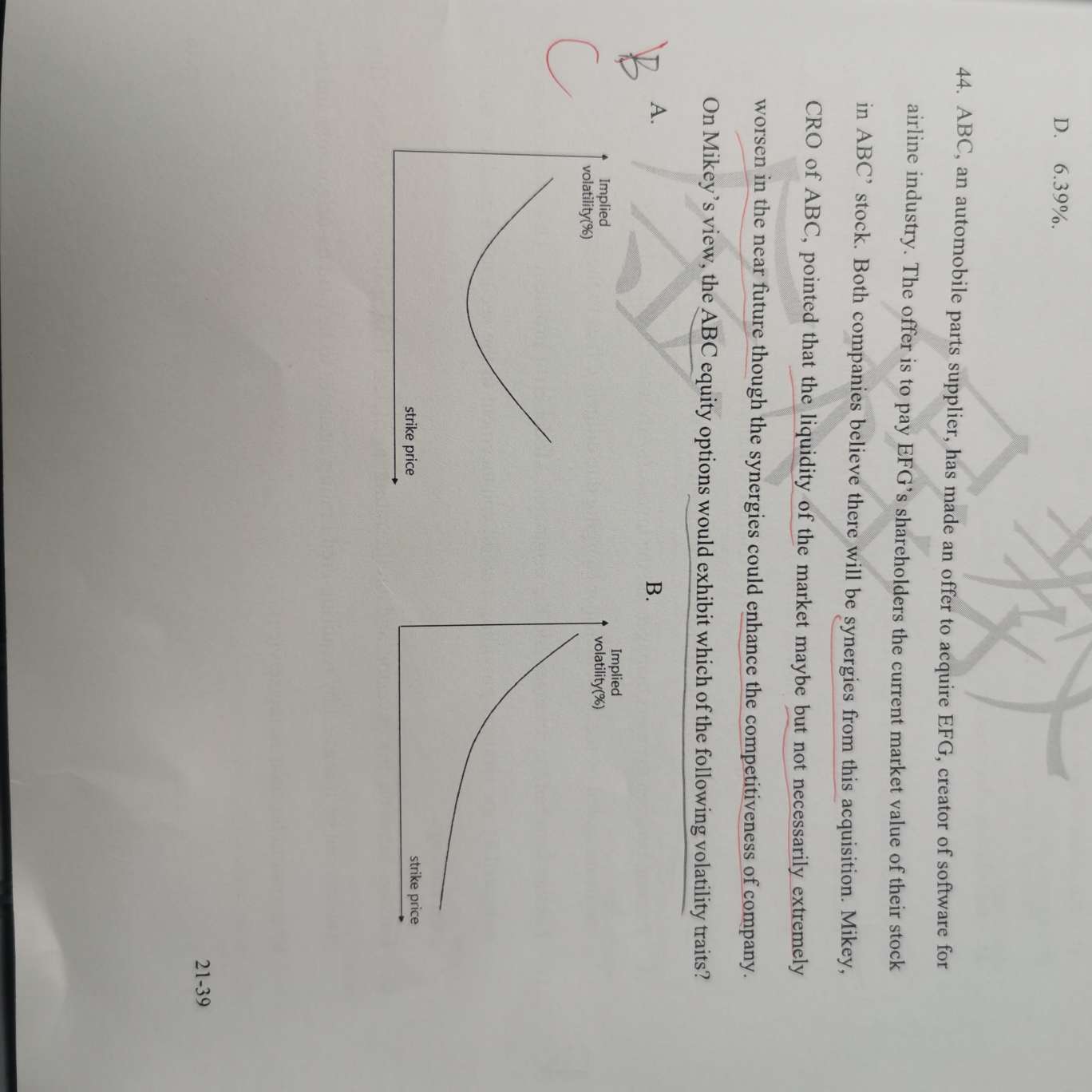 请问这个题为什么不是B呢?波动率Smirk和波动率皱眉有什么区别啊?什么时候是波动率Smik什么时候又是皱眉呢