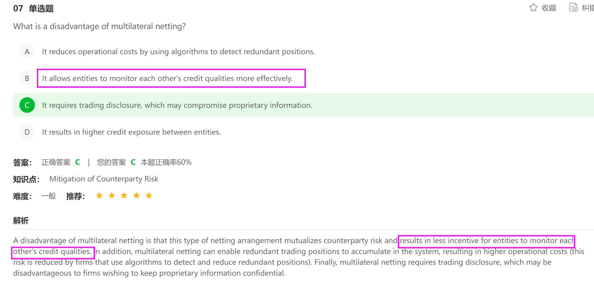 老师,这个解析跟选项有矛盾?还有解析里这个怎么理解? resulting in higher operational costs,为什么多边净额结算成本会变高?讲义里只说了交易压缩可以实现多边净额结算的好处,所以麻烦老师解释一下