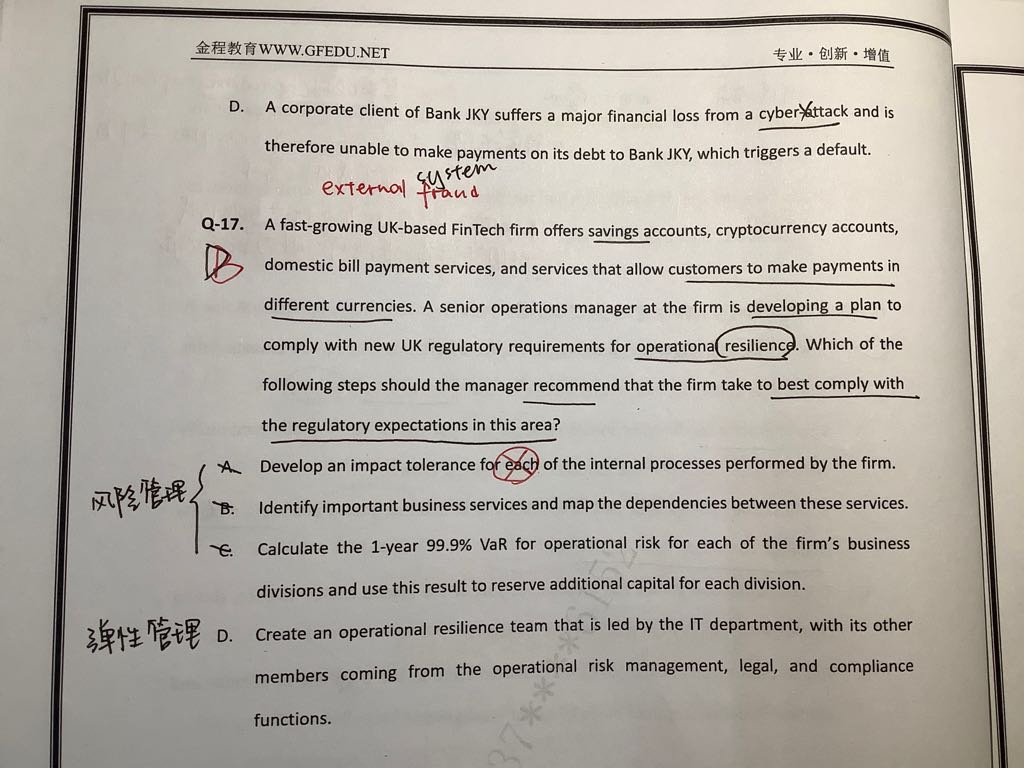 这题的B难道不是属于风险管理而不是弹性管理吗,D选项老师说不是由IT部门构成,但是它还有还有其他部门一起,感觉D没有问题呀