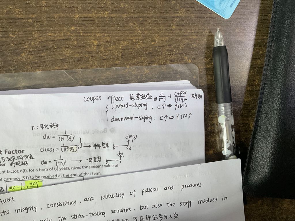 已回答感觉听老师讲的迷迷糊糊,三种映射是不是这么理解: 1、本金映射:不考虑coupon,只考虑本金,风险因子仅有平均到期时间,还是说coupin和本金都考虑了,加权的平均到期时间作为风险因子; 2、久期映射:通过风险因子久期考虑到了coupon和本金,对应的就是相应久期的零息债券; 3、现金流映射:将coupon和本金分别对应的久期进行相应久期零息债的对应,也就是说把这些久期放到久期篮子一一映射