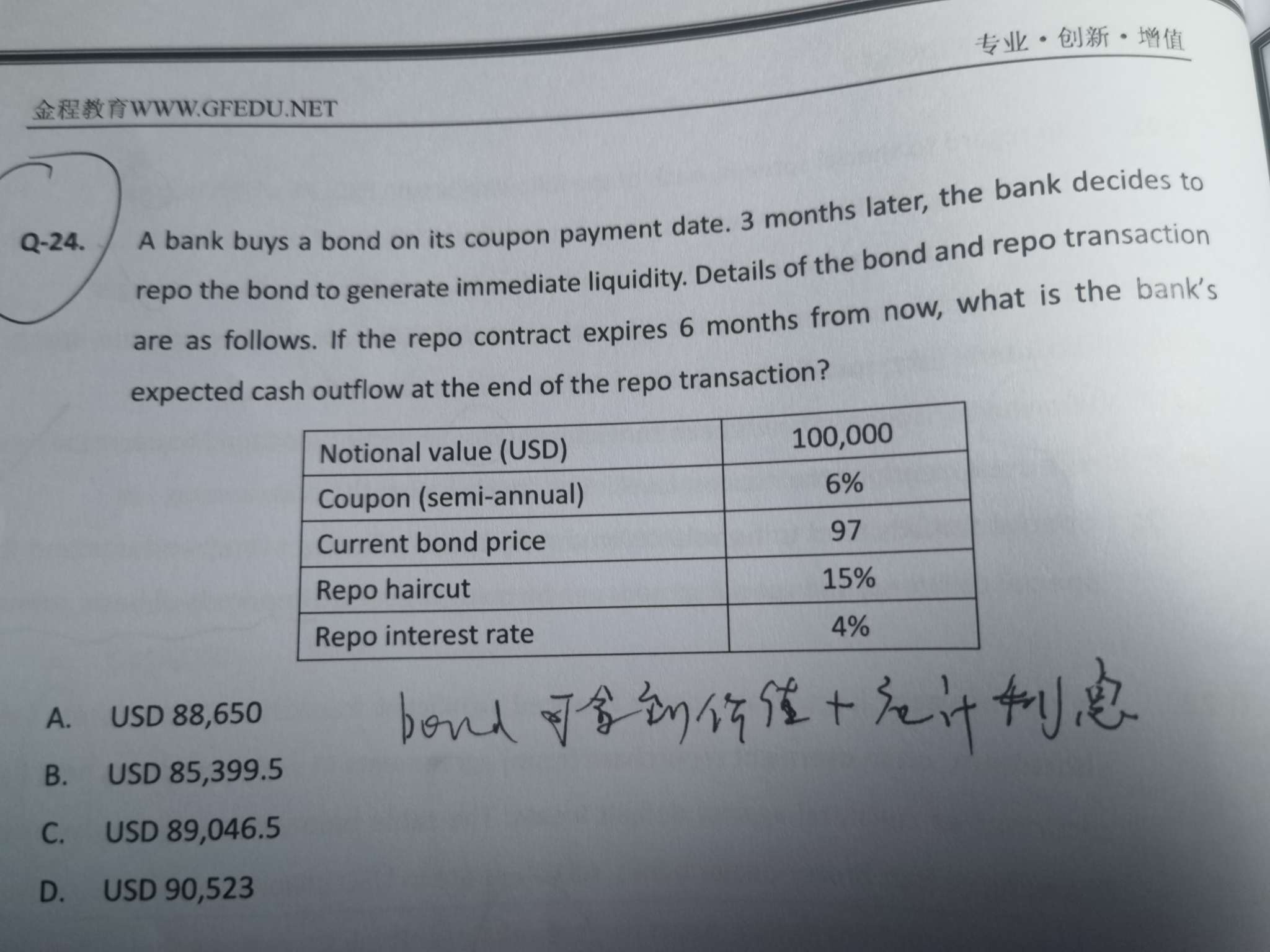 老师, 1.0月买bond并产生coupon,3月做repo,6个月后repo到期即9月。完整时间,不是在0月和6月产生了coupon,而repo是9月到?我梳理的时间线对吗? 2.repo抵押物价值计算原则是什么?抵押物期间产生的现金流归谁? 3.为什么coupon的3个月计算进去,不用贴现吗?