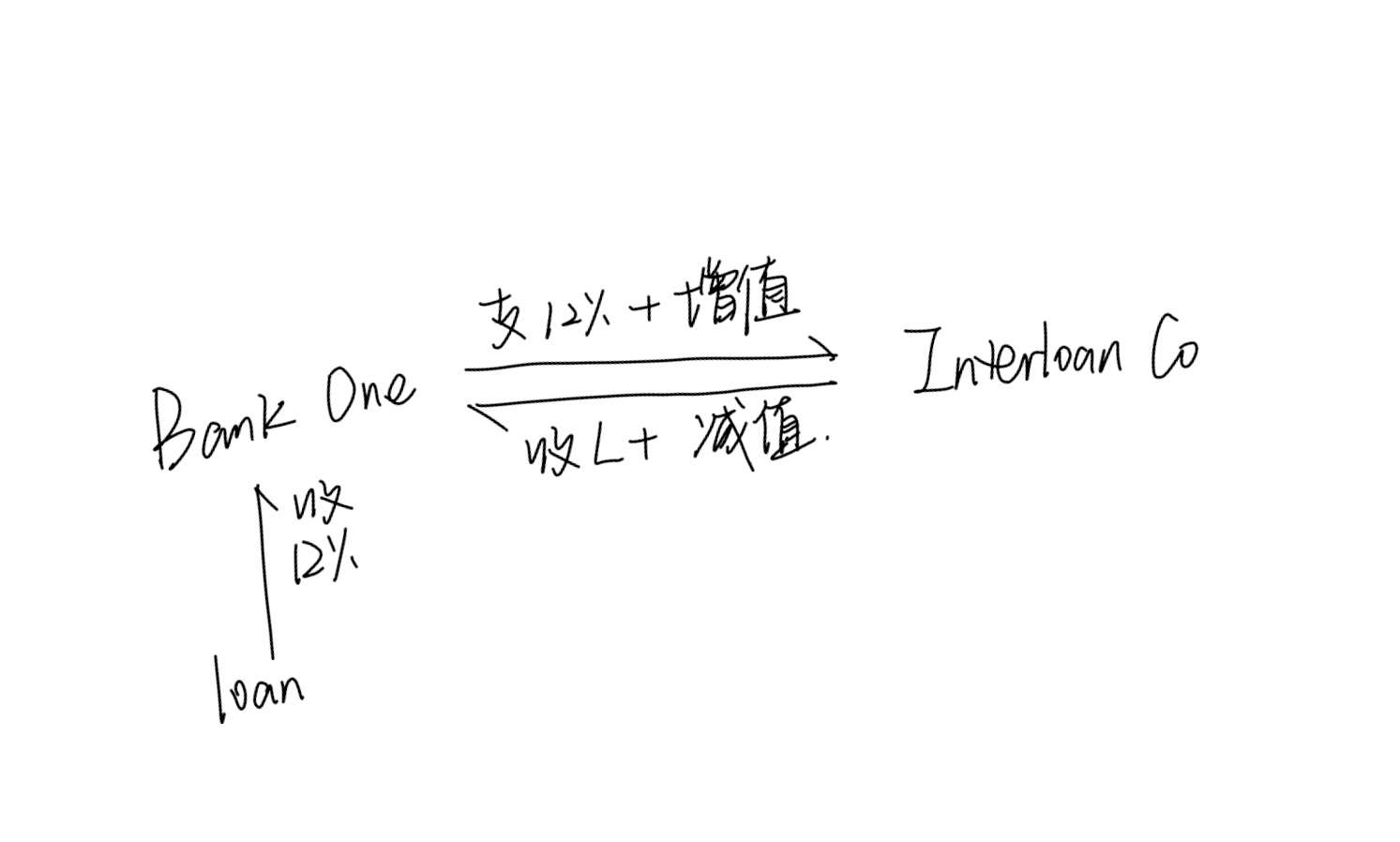 老师,我有个问题,我知道TRS的流程,但是我有点不明白,在题目中明确说了bank one贷款给软件公司并且收到固定利息12%,然后通过TRS再把这部分利息转给Interloan Co,然后收到LIBOR+减值的部分,那对于bank one来说不就只有收LIBOR+减值部分吗?