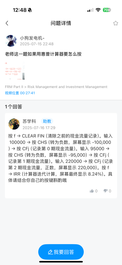 FRM问答包含在线课程、FMR通关课程、FRM试题等所有FRM相关问题,每个问题老师均会在24小时内给出答疑回复哦!