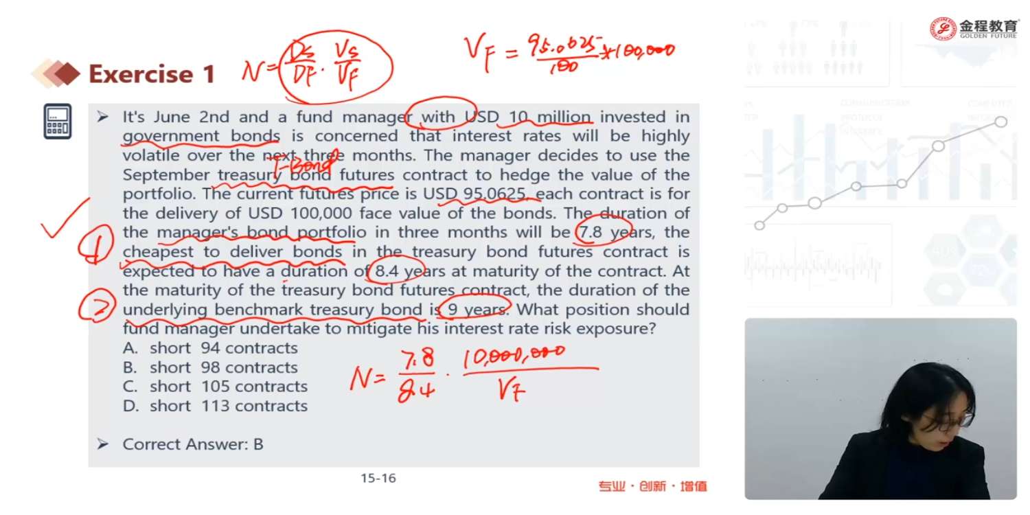 查看试题 已回答这里的Df既然用了CTD的8.4年,那么Vf为什么直接用95.0625,而不考虑CTD的问题,用CF来进行调整? 如果不想算CF的话,那么按照匹配原则,是不是应该Df用underlying的9年,来匹配Vf的95.0625呢?