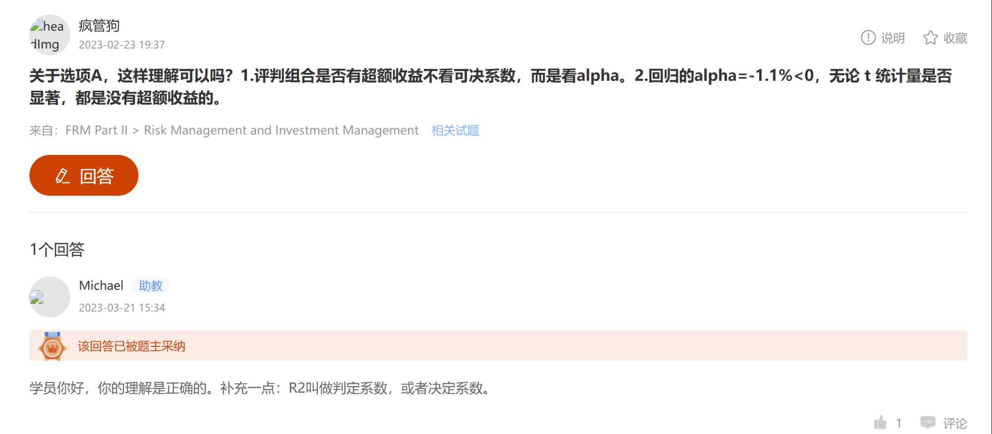 这道题针对A选项,我们判断基金经理是否相对基准为我们带来收益,是看的alpha的检验统计是否显著吧,而与a本身数值正负无关,如果显著,无论对于a是正数还是负数,它都可以为我们带来相对基准的收益?这个图片上的问答感觉就是错误的。